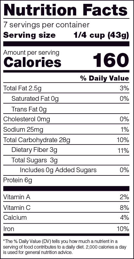 Microwave: In a microwave safe container combine 2 cups water, 1 cup of quinoa mix (shake contents in canister before measuring to mix the species & vegetables), and ½ tablespoon of olive oil or vegetable oil. Cover loosely. Cook on high for 5 minutes, stir & re-cover. Reduce heat to medium and cook for 8 minutes. Let stand for 5 minutes. Fluff with a fork before serving.