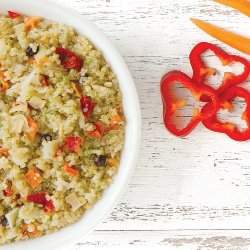 - Ingredients Prewashed Quiona, Dried Vegetables (Potatoes, Carrots, Onions, Red Bell Pepper), Currants, Spices, Salt, Mustard Seeds. Gluten Free.