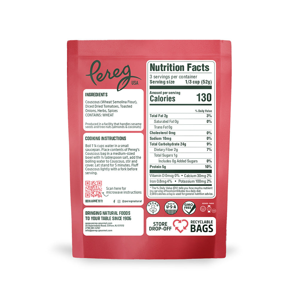 - Ingredients Couscous (Wheat Semolina Flour), Diced Dried Tomatoes, Toasted Onions, Herbs, Spices. Contains Wheat.
